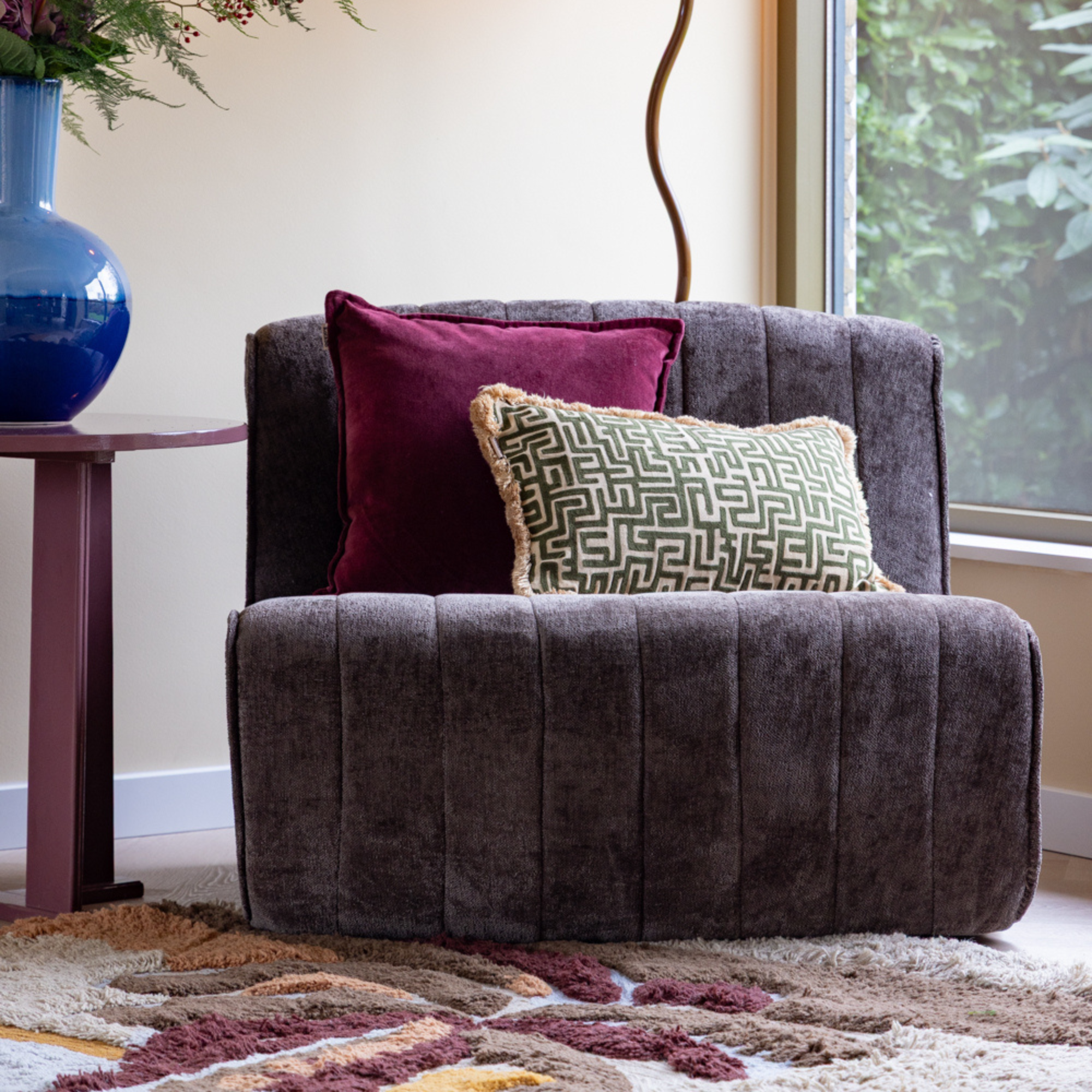 De Fenna set is ontworpen om op te vallen en tegelijkertijd eenvoudig te combineren met andere interieuritems. De combinatie van mauve en olijfgroen maakt deze set veelzijdig, ideaal om te mixen met andere materialen en neutrale kleuren.