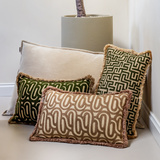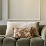 Bold Beige Swirl (30 x 50 cm): een speels kussen met een beige golvenprint, afgewerkt met franjes. Het handgemaakte ontwerp geeft extra textuur en een luxe uitstraling.