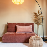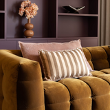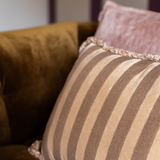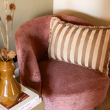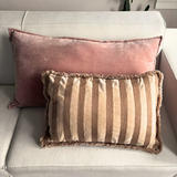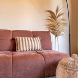 This set is all about balance. The solid pink cushion has a soft, warm look and is a beautiful eye-catcher without being overpowering. The beige cushion with subtle stripes and playful fringes adds a natural and airy touch. Together, they create a harmonious combination that works perfectly with a variety of styles. Moreover, the fabrics feel luxurious and remain beautiful even after many uses.