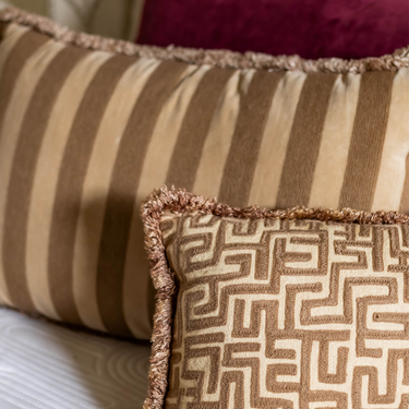 – Bold Beige (40 x 60 cm): elongated cushion with subtle striped design and fringes in natural beige