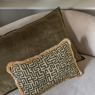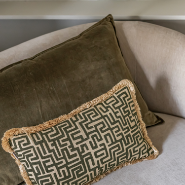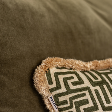 De sierkussenset June ademt rust, verfijning en natuurlijke elegantie. Met een combinatie van diepe olijfgroene tinten en een speelse beige print brengt deze set balans en harmonie in iedere ruimte.
