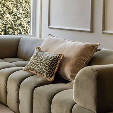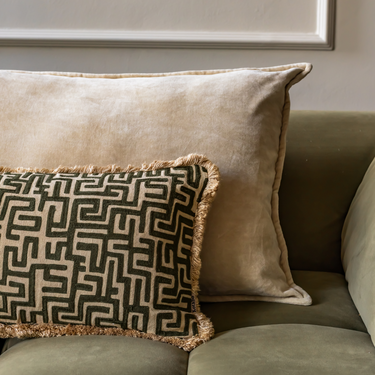 Olive Oasis Griekse print (30 x 50 cm): een beige kussen met olijfgroene Griekse print en speelse franjes. Subtiel, maar toch een echte blikvanger.