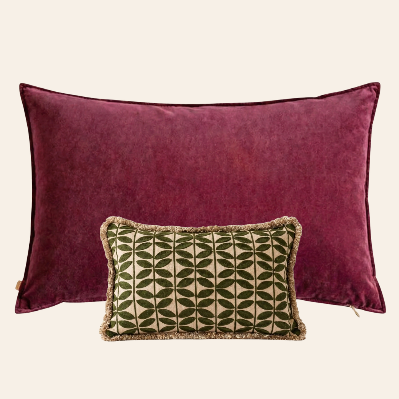 The Amara set combines the XL Magical Mauve cushion (50 x 90 cm) with the 30 x 50 cm Olive Oasis cushion with a butterfly print and fringe. The deep mauve shade creates a calm, rich base, while the printed and textured olive green accent adds a refined touch. Together, they instantly add character and ambiance to your sofa, armchair, or bed.