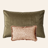 The Meau set combines the XL Olive Oasis cushion (50 x 90 cm) with the 30 x 50 cm Bold Beige cushion with a swirl print and fringe. The deep green shade creates a natural, calming base, while the beige accent with its graphic print and texture adds subtle character. Together, they instantly add ambiance to your sofa, armchair, or bed.