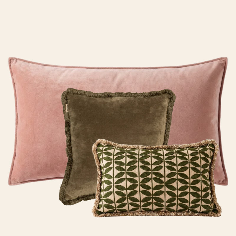 De Molly set brengt een verrassende, eigentijdse kleurencombinatie samen: het XL-kussen Pretty in Pink (50 x 90 cm), het 45 x 45 cm kussen Olive Oasis met franjes en het 30 x 50 cm kussen met butterfly-print in Olive Oasis. Zacht roze en diep olijfgroen vormen een chic contrast dat warmte én verfijning toevoegt aan elke zithoek.