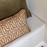 Bold Beige (30 x 50 cm): een speels kussen met een swirl-print en franjes. De warme beige tint met print voegt textuur en balans toe.