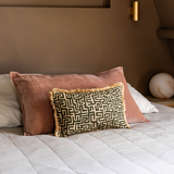 Olive Oasis (30 x 50 cm): een speels kussen met een groene print en franjes. Het handgemaakte ontwerp geeft extra textuur en een luxe uitstraling.