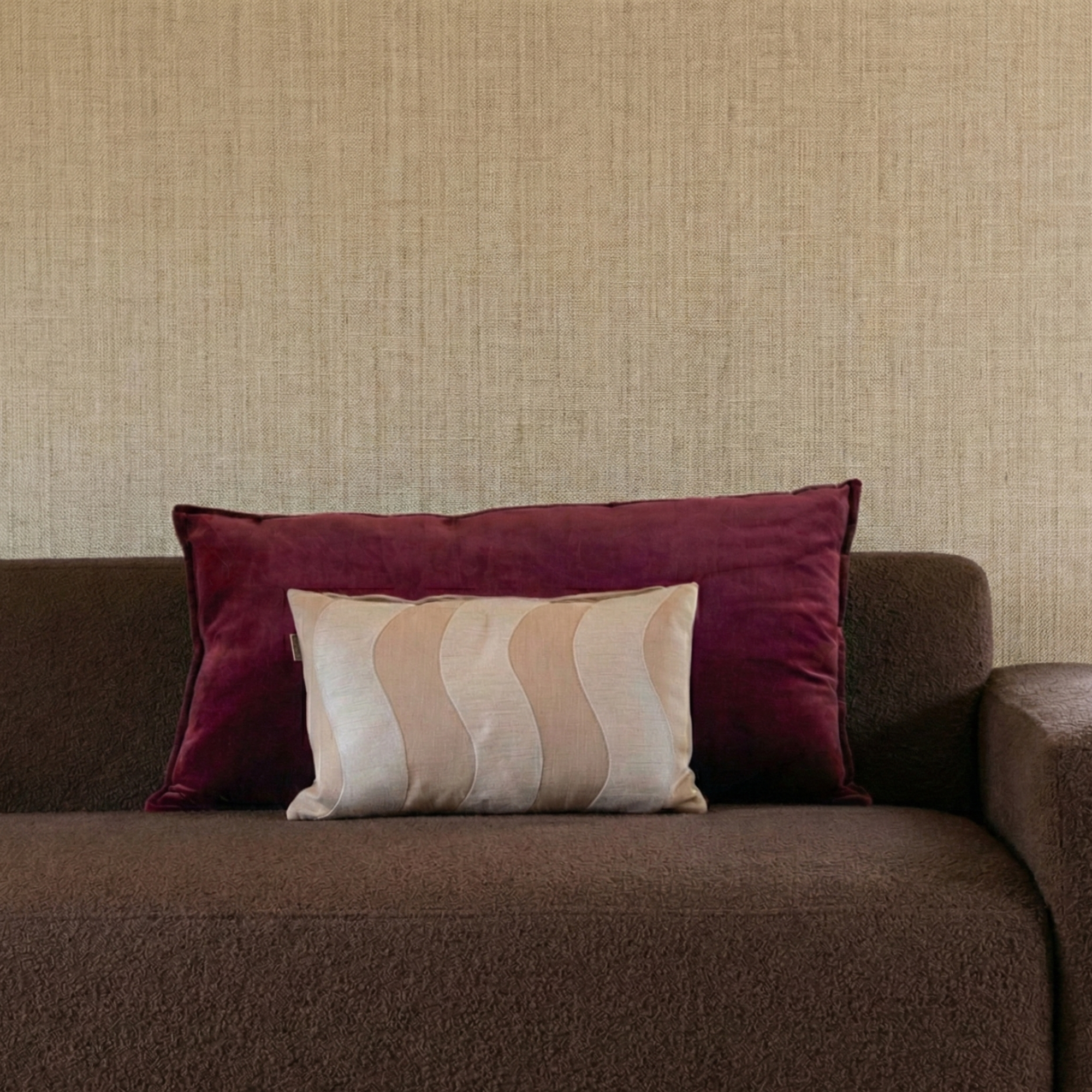 De Claire set combineert het XL-kussen Magical Mauve (50 x 90 cm) met het 30 x 50 cm kussen in Beige met verticale golvenprint en franjes. De diepe mauvetint vormt een rustige basis, terwijl het beige kussen met print en textuur een verfijnd accent toevoegt.