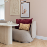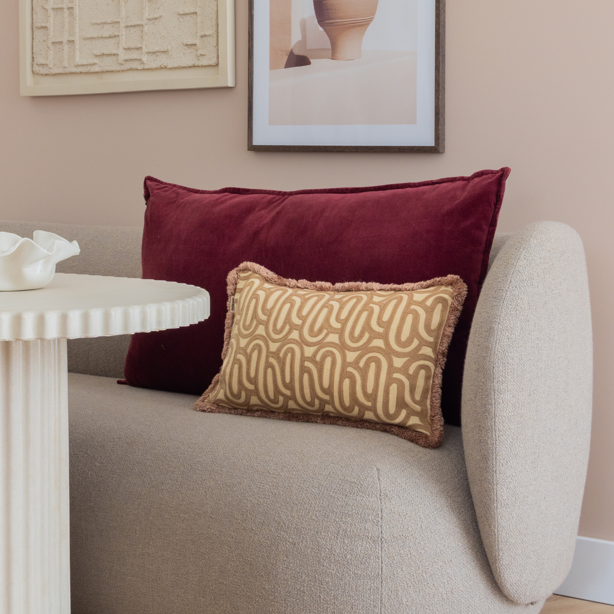 De franjes en swirl-print geven het beige kussen net dat beetje extra, terwijl het mauve kussen zorgt voor een rijke, rustige basis. Samen zijn ze een tijdloze keuze die je eenvoudig kunt combineren met andere kleuren en materialen.