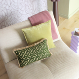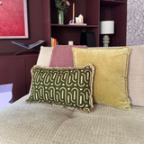 – Olive Oasis (30 x 50 cm): een rechthoekig beige kussen met olijfgroene print en speelse franjes, subtiel en verfijnd tegelijk