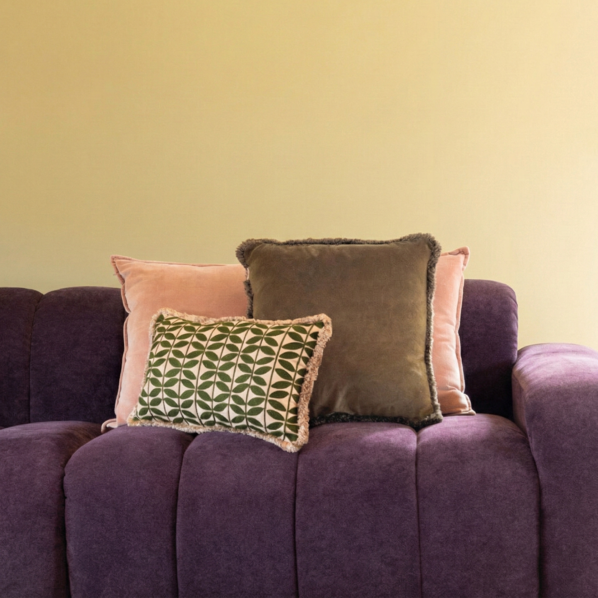 De Molly set brengt een verrassende, eigentijdse kleurencombinatie samen: het XL-kussen Pretty in Pink (50 x 90 cm), het 45 x 45 cm kussen Olive Oasis met franjes en het 30 x 50 cm kussen met butterfly-print in Olive Oasis. Zacht roze en diep olijfgroen vormen een chic contrast dat warmte én verfijning toevoegt aan elke zithoek.