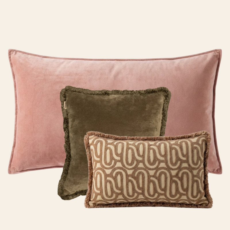 De Elize set combineert drie zorgvuldig gekozen tinten en formaten: het XL-kussen Pretty in Pink (50 x 90 cm), het vierkante kussen Olive Oasis (45 x 45 cm) met franjes en het rechthoekige kussen Bold Beige (30 x 50 cm) met subtiele swirl print en franjes. Zacht roze vormt een warme basis, Olive Oasis voegt een natuurlijk accent toe en Bold Beige geeft structuur en speelsheid. Samen creëren ze een elegante, gebalanceerde mix voor bank, fauteuil of bed.